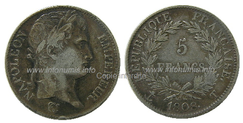 Voici une photo de la 5 francs 1808T. Pour la petite histoire, son précédent