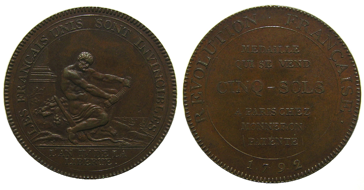 à l'Hercule ("QUI SE VEND") 10 a- 1792 Tranche lisse (existe sur flan lourd ou léger) Comme en deux sols, ce monneron est rare.