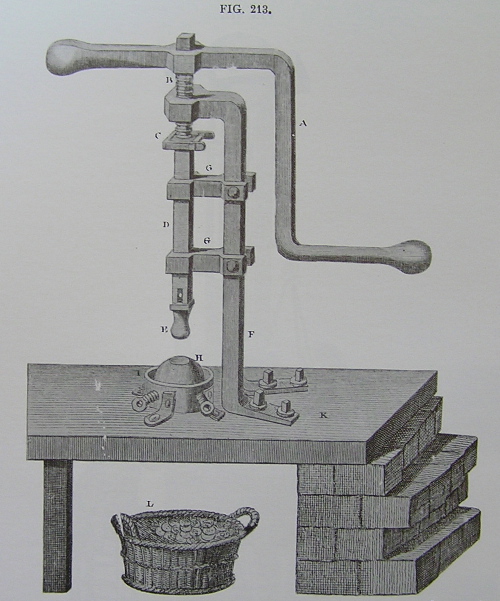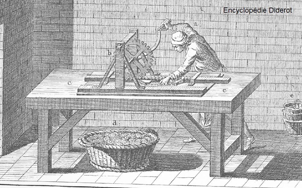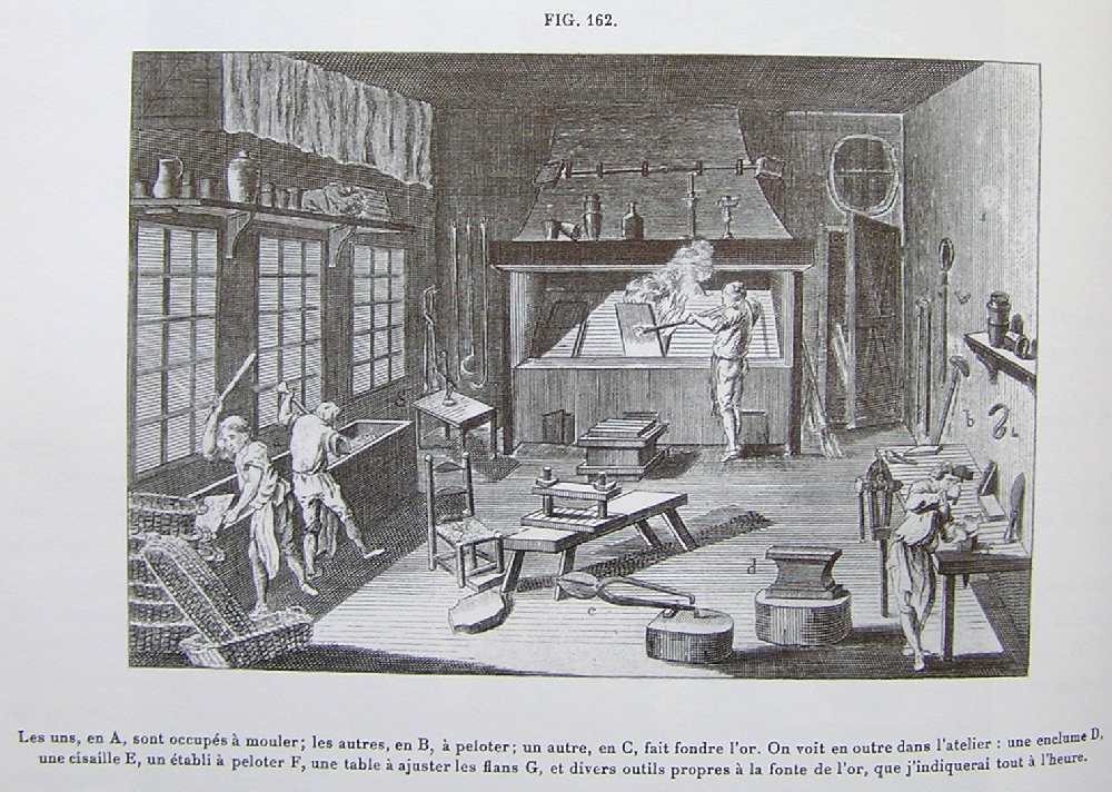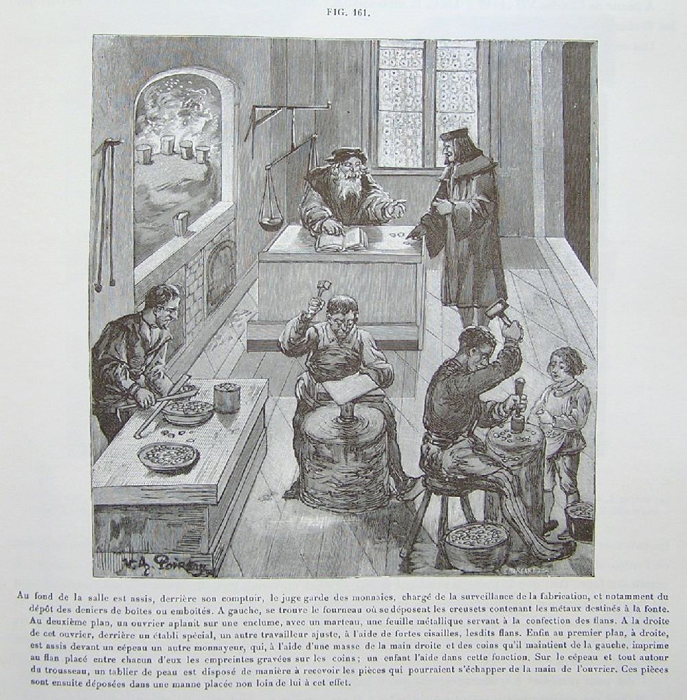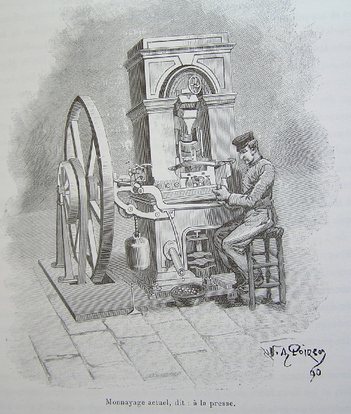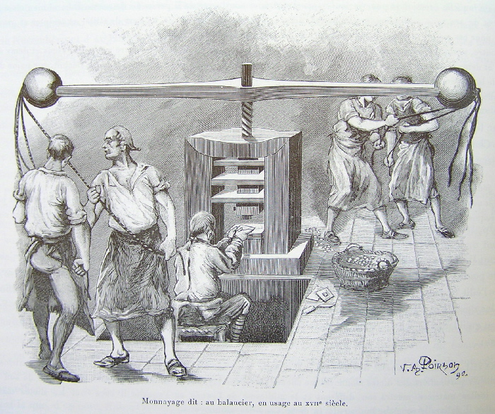 Evolution de la fabrication des monnaies en image (issues de l'ouvrage de Dewamin) : Gravure 1 : la frappe au marteau Gravure 2 : la préparation des flans Gravure 3 : l'utilisation du mouton (XVI°) Gravure 4 : un coupoir pour découper les flans dans une lame Gravure 5 : illustration d'un balancier (XVII°) Gravure 6 : la presse monétaire de Thonnelier (XIX°)