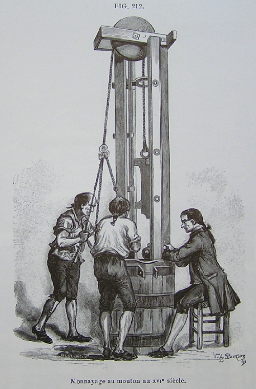Avant l'apparition du balancier et depuis le XVI° siècle, on utilisait un mouton pour frapper ou découper les monnaies :