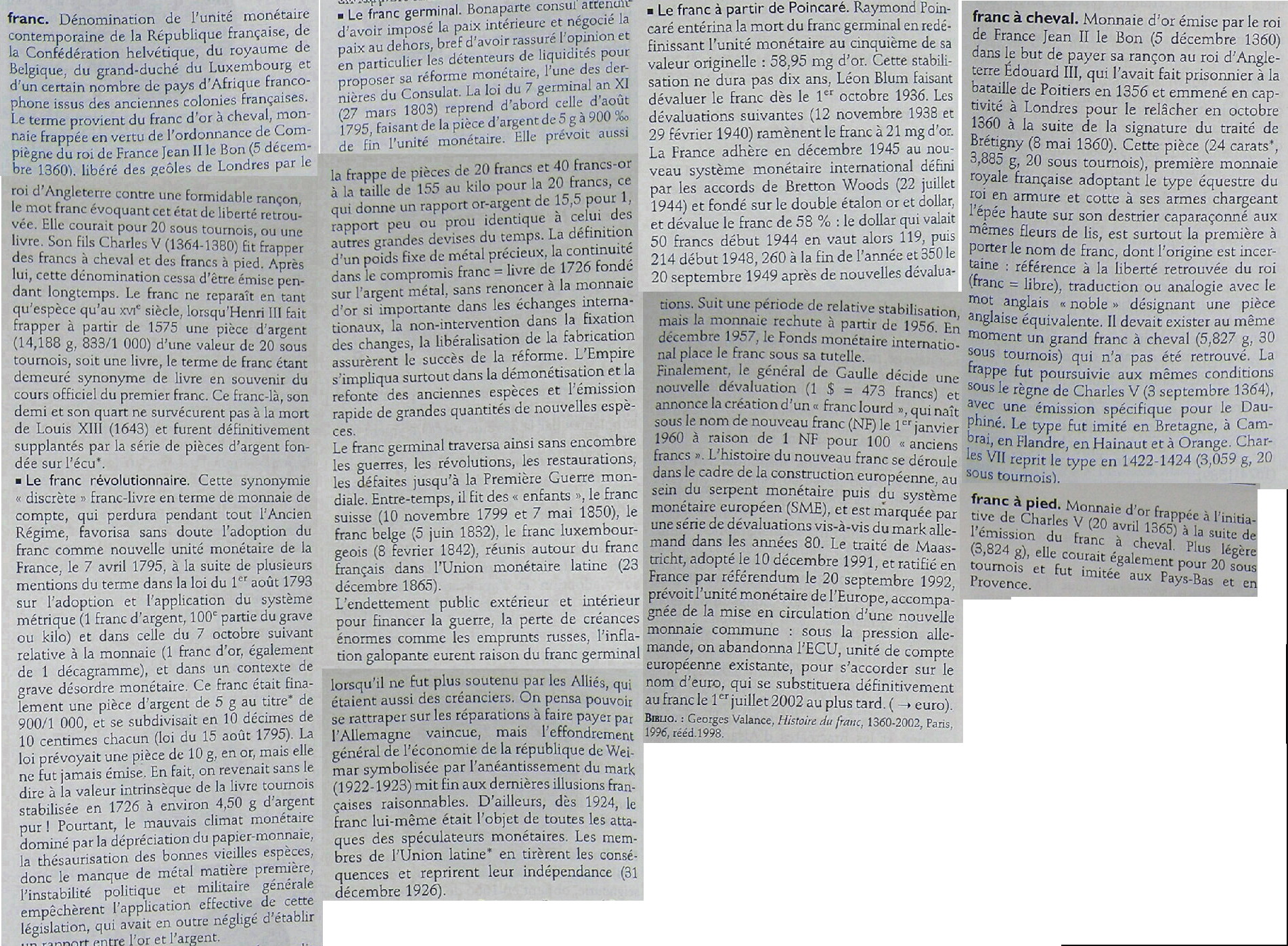 Public et de la Banque de France. Système duodécimal (base de 12) : Système de poids et mesures utilisé jusqu'à la mise en place du système décimal actuel. Numismatiquement il fallait : - 1 liard pour faire 3 deniers, - 12 deniers pour faire 1 sol (le sou), - 20 sols pour faire 1 livre (environ 1fr), - 6 livres pour faire 1 écu, Dans le système décimal (base de 10), le franc est divisé en 10 décimes ou 100 centimes. De plus, avant que la valeur ne soit indiquée sur les monnaies, la valeur de celles-ci était fixée par ordonnance des souverains. Ils fixaient l'importance de la monnaie en fonction du cours des métaux et des circonstances économiques. Ces ordonnances prévoyaient aussi à quel taux les monnaies étrangères pouvaient être acceptées. Petite histoire : dans l'antiquité, les Sumériens découvrirent que le chiffre 10 ne pouvait se diviser que par 2 ou 5 alors que 12 était divisible par 2,3,4 et 6. Ils adoptèrent donc la douzaine pour faciliter les calculs commerciaux. Les Romains diviseront ensuite le pouce et 12 onces, l'année en 12 mois et le jour en 12 heures... Beaucoup de nations utilisent encore